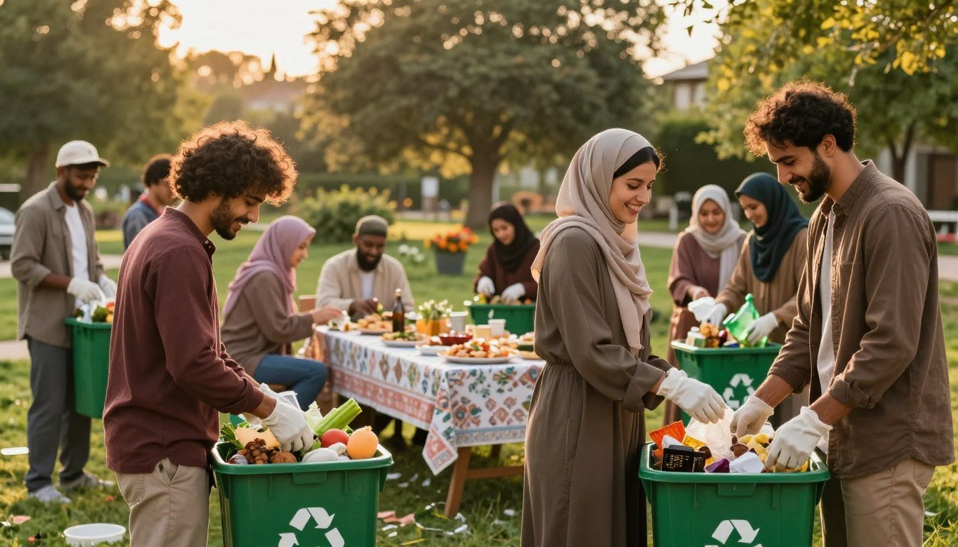 A serene outdoor gathering showcasing a sustainable iftar meal, emphasizing a plastic-free and waste-free environment. In the foreground, a beautifully arranged wooden table is set with artisanal ceramic plates filled with colorful, fresh, and organic foods like dates, salads, and traditional dishes in glass containers. Eco-friendly cutlery and reusable cloth napkins add to the ambiance. The middle ground features diverse individuals dressed in modest casual clothing, smiling and enjoying the meal, with a gentle sunlight filtering through green trees, creating a warm and inviting atmosphere. In the background, a lush garden setting complements the scene, promoting a sense of tranquility and harmony with nature. The image is softly lit to evoke a peaceful mood, captured with a balanced depth of field to highlight the meal and the joyful connections among the people.