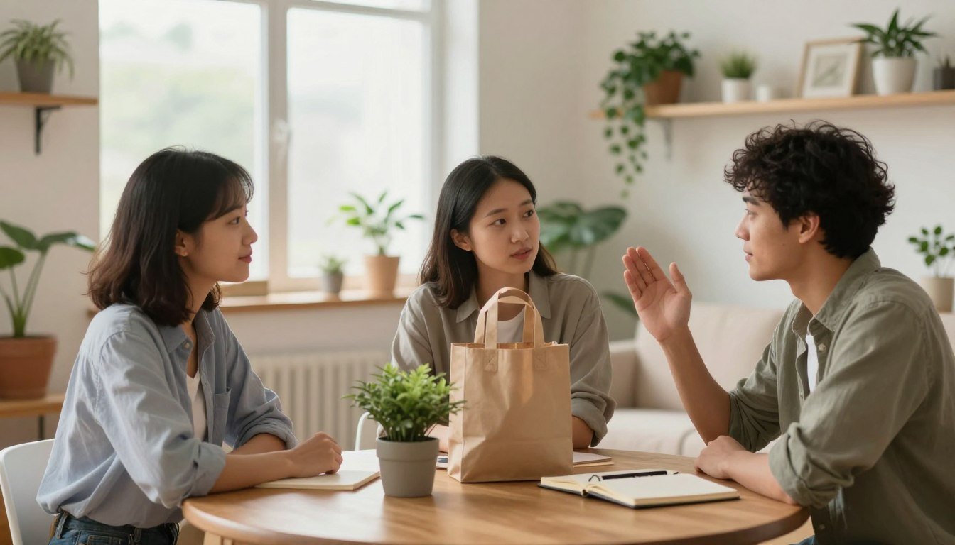 A cozy, modern living room setting featuring a diverse group of three individuals engaged in a thoughtful discussion about reducing consumer habits. In the foreground, a middle-aged woman, dressed in smart casual attire, gestures as she shares ideas on minimalism. In the middle, a young man, wearing a neat shirt, takes notes on a notepad, while an older gentleman, donned in casual but respectable clothing, nods in agreement. The background showcases a shelf lined with books about sustainable living and budgeting, along with green plants that symbolize growth and responsibility. Soft natural light filters through a window, creating a warm and inviting atmosphere that encourages reflection and dialogue on the topic of mindful purchasing. The camera angle is slightly elevated, giving a clear view of their engaged expressions and the inviting space around them.
